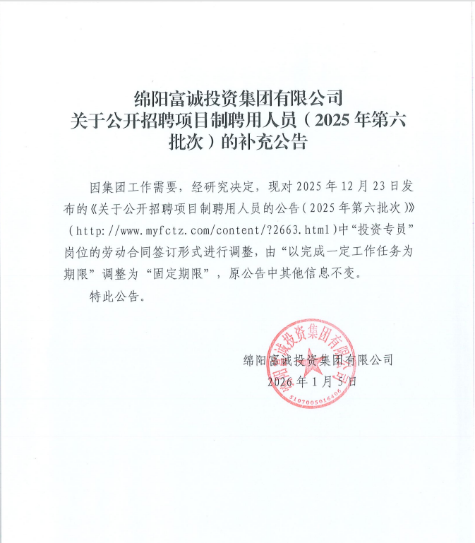 绵阳富诚投资集团有限公司关于公开招聘项目制聘用人员(2025年第六批次)的补充公告